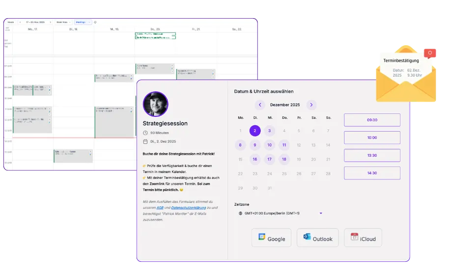 Automatische Terminvergabe, Erinnerungen und Zoom Integration.