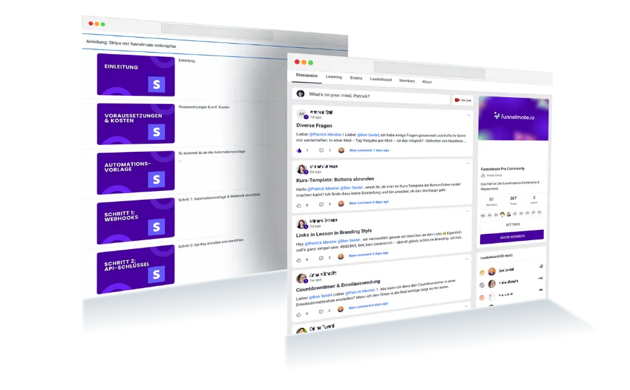 funnelmate wächst mit dir, vom ersten Funnel bis zu Launches, Evergreen-Webinaren und Community-Bereichen.